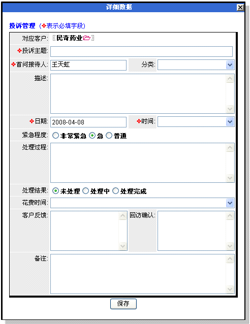 一般来说,销售人员在客户视图内记录投诉;而客服人员在客服控制台记录投诉。