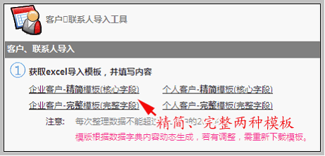 当导入客户为一个公司,是“企业性质”时我们需要下载企业客户导入模板。如:上海飞奥德科技有限公司,则需下载企业客户模板。 企业客户模板包含“客户基本信息”和“联系人”信息。在导入客户数据的同时,也可将企业客户的联系人一并导入。 企业客户模板分为“企业客户精简模板”和“企业客户完整模板”。“企业客户精简模板”中为客户基本信息中的核心字段。若了解到的客户信息较少时,可满足使用。“企业客户完整模板”中为客户基本信息的完整字段(暂无自定义扩展字段)。当导入的客户信息较完整时,可下载“企业客户完整模板”进行导入。 如下图: