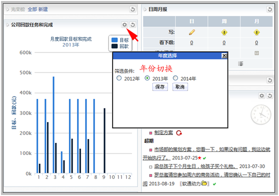 每一个销售人员均可根据自己的需求,切换工作台“年份回款和完成”,实现自我激励及对销售目标的及时掌控。