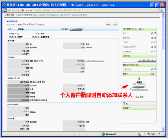 在客户视图内看到:个人客户新建时自动新建了联系人