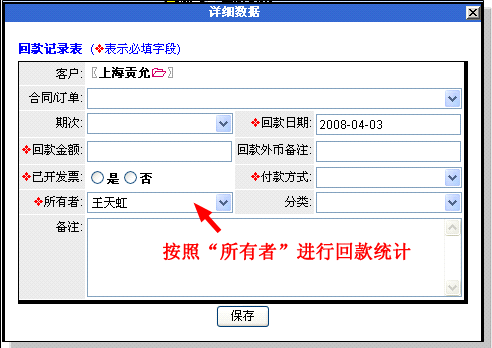 这里需要注意的是“所有者”字段,系统按照这个字段的人员姓名统计回款业绩。 一般来说,选择该回款所属订单的跟单销售人员,或者该回款客户对应的销售人员。 已开发票如果选择“否”,则会在该回款保存后,自动在其后面出现“开票”的按钮,如下图: