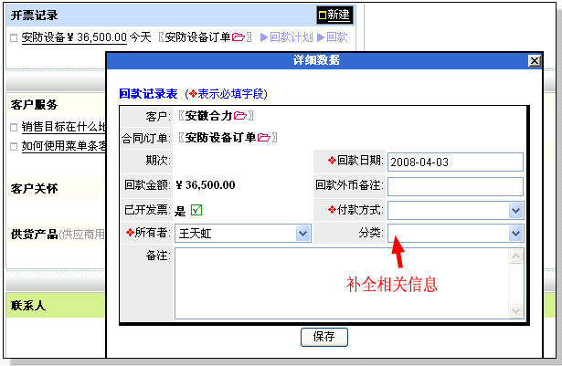 保存后,在回款记录中出现与该回款计划相对应的回款记录,如下图所示: