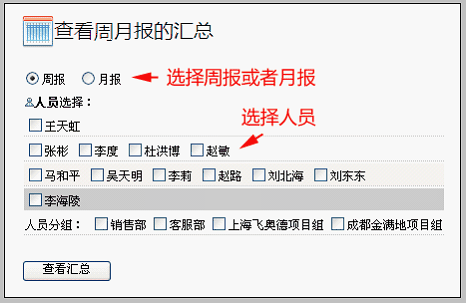 选择周报或月报,选择人员,点击查看汇总。看到如下图所示: