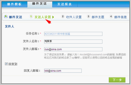 发送人设置 发送人设置步骤,界面如下: