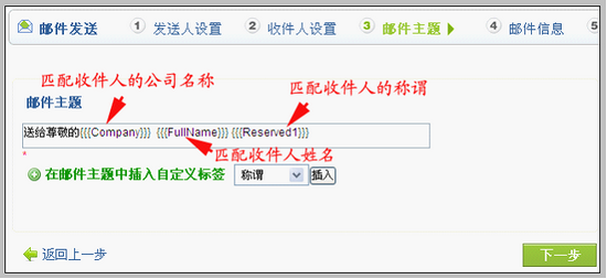 在填写邮件主题时,可以插入自定义标签。方法与上面我们讲过的在邮件模板中光标处插入自定义标签是类似的,不再赘述。样式如下图: