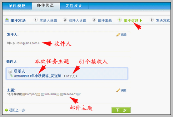 邮件主题填写好之后,点击“下一步”,进入邮件信息步骤。 确认本次任务信息 邮件信息步骤,界面如下图: