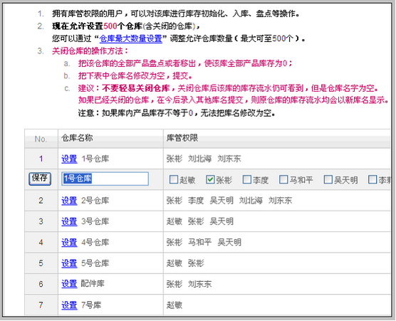 点击设置,直接录入仓库名称选择管理人员然后点击保存,如图: