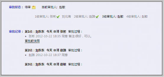 我们看到审批人“赵路”已经审批同意。等待下级审批人“赵敏”审批。这时“赵路”若想重新审批,则可使用重审功能。