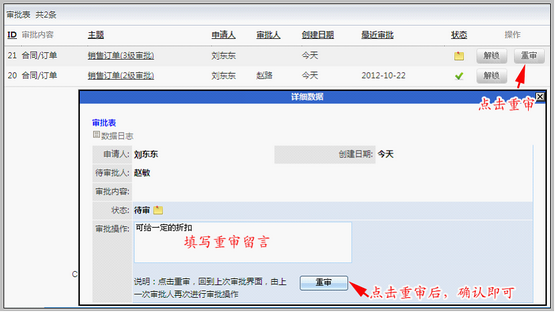 重审操作 审批人进入到“审批列表”下,点击“重审”,录入重审留言,重审后可重新操作审批。 如下图: