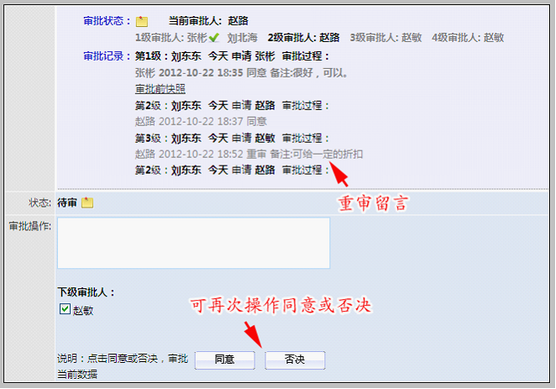 重审后,该审批人可重新操作审批“同意”或“否决”。 如下图: