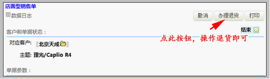 店面单退货的办理方式和订单退货一样,均在相应的视图内操作。