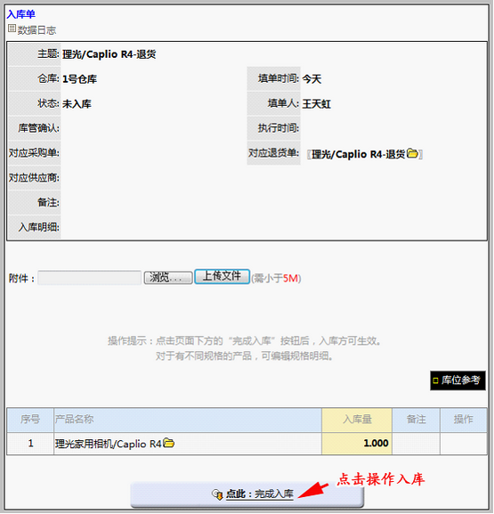 注意:入库单中的入库仓库和产品明细是不能做改动的。