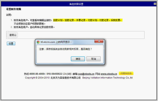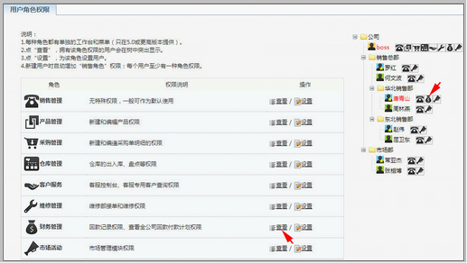 说明 XToolsCRM将用户工作职能分为八种角色:销售管理、产品管理、采购管理、仓库管理、客户服务、维修管理、财务管理和市场活动。 入口:老板职能à账户à角色设置。 角色设置 例如,以设置财务管理角色为例,点击“财务管理”后的“设置”,如下图: