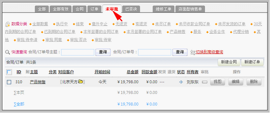 新建的订单所在标签为“未审批” 新建的订单还未开始审批,所以在合同订单列表中,自动进入未审批标签。 当然,我们也可以在“全部”标签中看到这个订单。 如下图:
