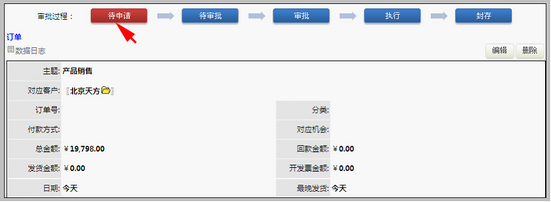 新建订单审批状态为“待申请” 进入到订单视图中,可看到该订单处于审批过程的“待申请”状态上。 如下图: