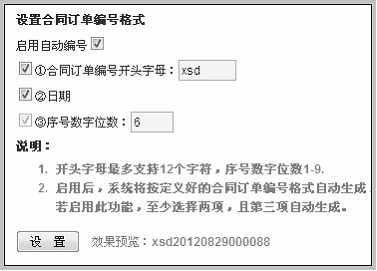 设置成功后,合同订单号根据设置格式自动生成,可在“效果预览”中查看显示格式。 若设置“序号数字位数”较小,如设置为:1位,且两位整数已全部生成,合同订单号将自动生成3位数字。同时在系统设置中,“序号数字位数”不可低于2位。 如下图提示: