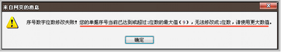 设置成功后,合同订单号根据设置格式自动生成,可在“效果预览”中查看显示格式。 若设置“序号数字位数”较小,如设置为:1位,且两位整数已全部生成,合同订单号将自动生成3位数字。同时在系统设置中,“序号数字位数”不可低于2位。 如下图提示: