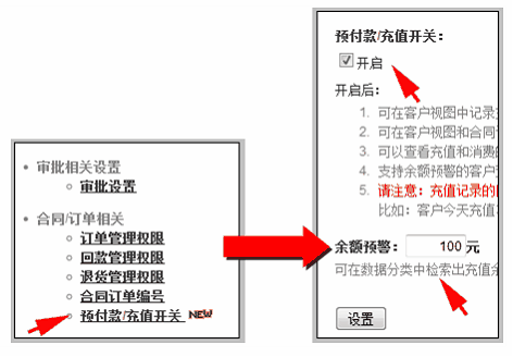 启用预付款时,需要先设置预付款余额预警,方便管理此类客户消费情况。