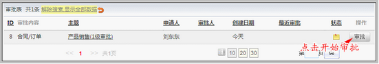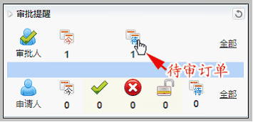 在上面的讲解中,申请审批时我们已选择了审批路径“销售1部500万大单”,我们选择的一级审批人为“李度”。 一级审批人“李度”在工作台审批提醒中,可看到此待审批的订单。 如下图: