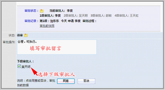 审批“同意”,选择下级审批人 |