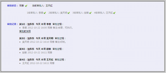 说明: 1、填写审批留言,方便申请人与下级审批人看到审批意见 2、操作审批“同意”或“否决 3、其他级别审批人员操作方法相同,我们这里不再赘述。 当每一级别审批人均审批同意后,该订单审批过程变为“同意”,申请人可操作执行出库。 如下图: 所有级别审批人均已操作审批“同意”。