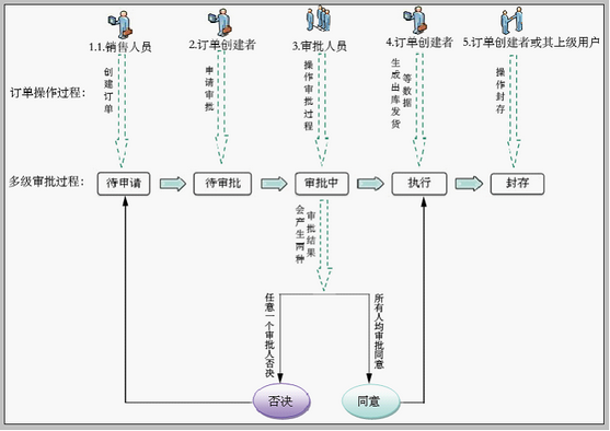 审批过程的总体说明 合同与订单多级审批过程一致,我们这里以订单为例进行说明。 如下图: