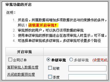 审批功能在开启之前,请确认订单的审批是必须的。因为开启审批后,如果希望关闭审批,则需要做大量的数据处理工作。具体请参见:“关闭前数据预处理”的功能。 所以,我们建议您,在开启审批前需经过分析过程,一旦确定开启审批,就不要轻易关闭了。