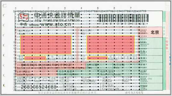 设计快递单内各个内容区域的参数 1)首先您要把快递单上需要填写的内容区域画出来,这会比较有利于您的设计。 都用矩形区域画出,例如下图申通快递单: 这几个内容区域分别是:发件人地址、发件人电话,收件人地址、收件人电话。 2)根据坐标尺,确定每个内容区域的左上角坐标(x,y),宽度和高度 具体的设置方法如下: 根据上图我们可以知道: 每个打印的空心小方块或者实心小方块均表示一个坐标单位1 您可以使用0.5表示半个单位 水平方向是x坐标,垂直方向是y坐标