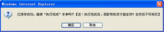 如果点击确定,则本单执行完成,全部数据生效。 如果点击取消,则保存本单的全部数据(包括回款、开票、发货),但并不执行。所以回款、开票、发货均不生效。 没有执行完成的销售发货单,在列表中可以看到“执行完成”的按钮。