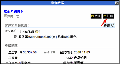 说明 包括:打印发货单、打印快递单、打印出库单。 具体指的是,通过上述功能,打印和店面型销售对应的相关单据。 从前面的教程您可知道,店面型销售单是优化操作的订单模型,所以店面型销售单和订单一样,也具有对应的发货单、快递单和出库单的打印需求。 打印方法 进入到店面型销售单之后,可以看到右上角的打印按钮,如下图: