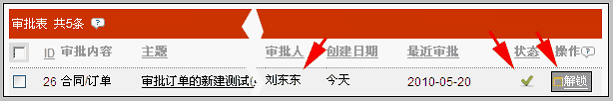 审批人:刘东东,状态:同意,操作:解锁。 如前所述,审批同意的订单,是可以由审批人执行解锁的(在发现订单审批错误,需要申请人重新修改时使用)。 点击主题,查看审批情况 审批后,点击数据的主题,还可以查看审批的详细情况。 进入后看到,该订单的状态=同意,审批过程也形成了完整的审批记录。如下图: