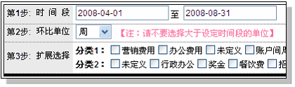 点击进入环比分析后,可以看到类似上图的界面。 第1步,选择分析数据的时间段。比如我们选择2008-04-01到2008-08-31 第2步,选择环比单位,如果选择月,则会出现4、5、6、7、8连续5个月的环比数据。 然后点击查看统计的按钮, 可以看到统计表和统计图。