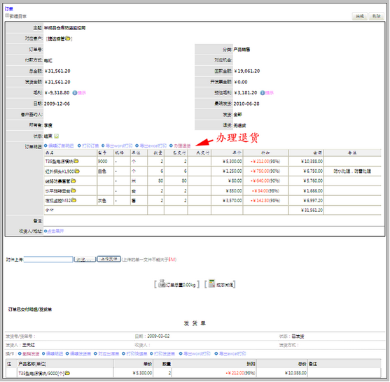 注意填写清楚应退款金额和退货后产品入库的仓库。其中:应退款金额在实际应用中应该是和客户事先沟通好的。填写后保存。保存后,即可在订单视图内,看到红色退货单。如下图所示: