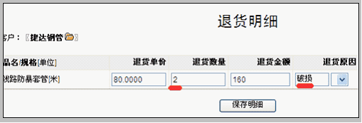 编辑退货单明细 在上一步退货单建立后,自动把订单明细中全部产品加入退货明细。编辑退货单明细的方法是:在退货单操作区域点击“编辑明细”。 进入退货单明细编辑界面,注意:这里的退货明细是自动从订单明细中读取全部的数据,操作时,只需要删除不必要的项目即可。具体如下: 只保留退货产品,修改退货数量,并填写退货原因。 保存明细。 至此,退货明细编辑完成。下面要做的是:使用退货单,管理退回产品的入库情况、管理退款情况。 管理退货入库 如上图所示,在明细编辑完成后的退货单底部,点击“生成退货入库单”的操作按钮。 点击后,系统根据退货单明细生成退货入库单。 等待库管人员确认该入库单入库。 记录退款 在退货单中,点击“新建退款记录(负回款)”按钮。 新建退款和新建回款的方法类似,区别在于:退款是用负回款实现的。如下图: 即:记录退款时必须在金额中带有负号。退款记录后,将在本订单视图中的回款模块中显示,如下图所示。 |