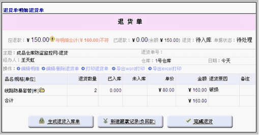 点击办理退货 点击办理退款,出现退货单新建界面,如下。