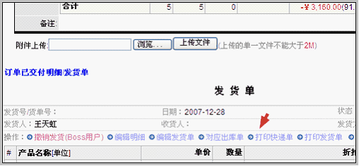 在订单试图中的发货单操作中打印 这里的打印主要针对的是发货单数据,如果是用快递给客户发货,即可打印发货单,也可打印快递单。具体方法如下: 1)找到该发货单对应的订单 2)进入订单视图,找到该订单对应发货单的操作区域,如下图所示: