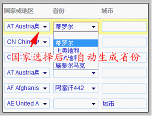 注意:“国家或地区”显示全部国家名称。若选择的国家未自定义省份,则在省份字段中,提醒国家未设置。